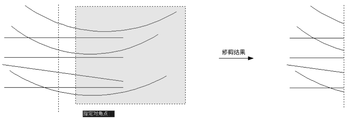 当修剪多个对象时,可以使用栏选和窗交两种功能。栏选功能需要绘制一条或多条栅栏线,所有与栅栏线相交的对象都会被选择,如图4-3和图4-4所示。