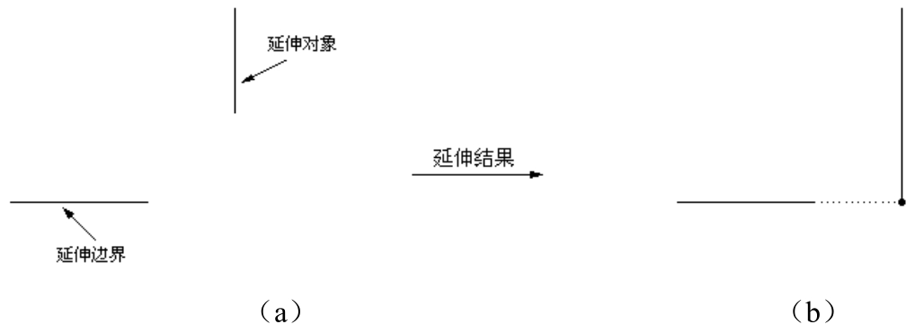 与“修剪”命令一样,在延伸对象时,也需要为对象指定边界。在指定边界时,有两种情况:一种是对象被延长后与边界存在一个实际的交点;另一种就是与边界的延长线相交于一点。