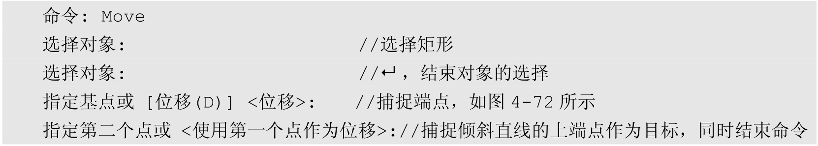 在移动对象时,一般需要使用点的捕捉功能或点的输入功能,以进行精确的位移。现将图4-71(a)中的矩形移动至图4-71(b)中的位置,具体操作步骤如下。