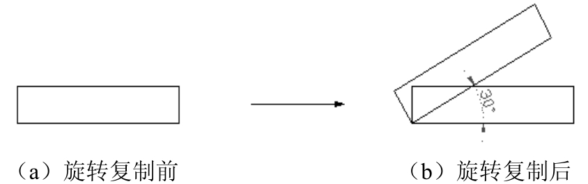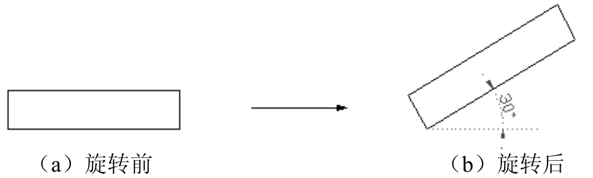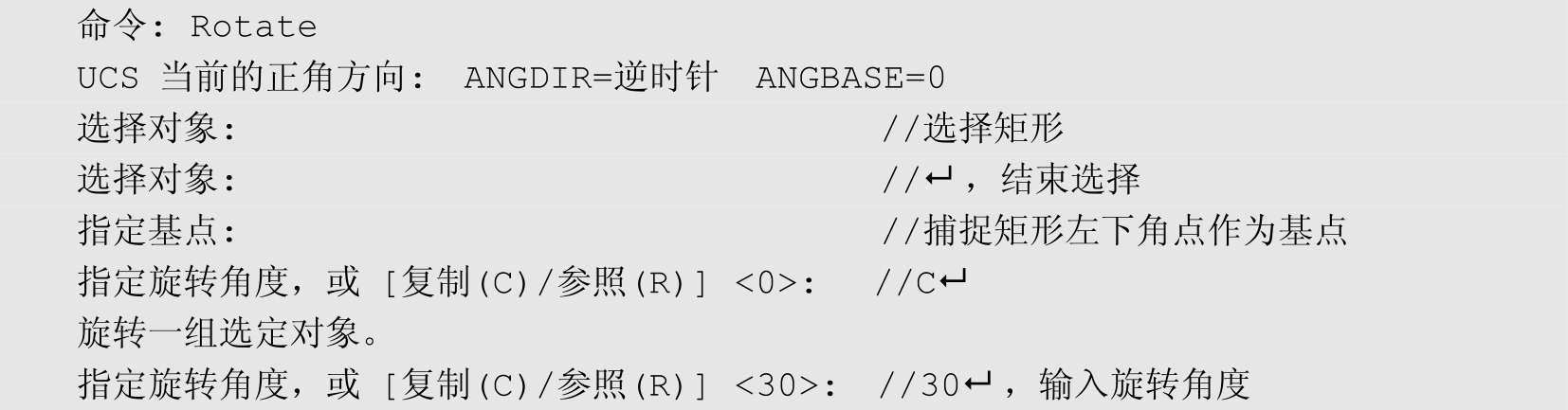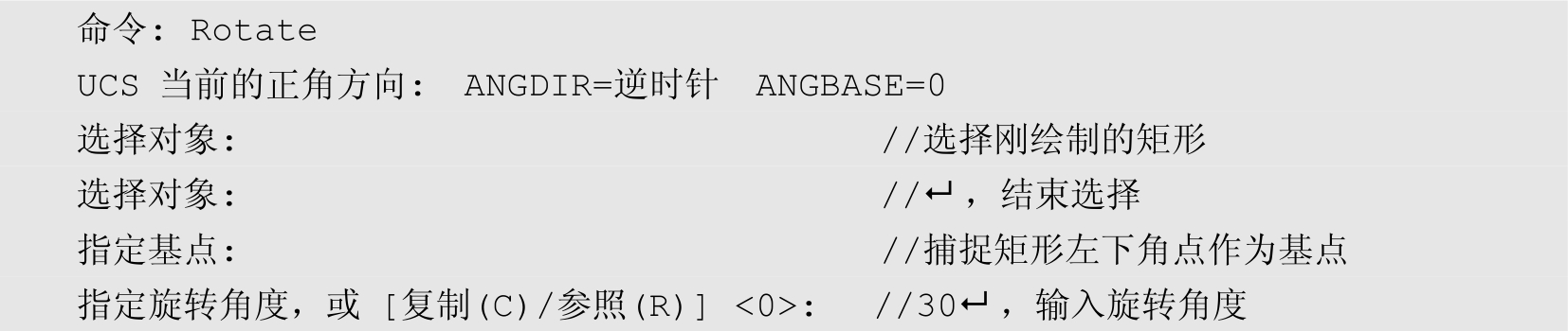 在旋转对象时,若输入的角度为正值,则系统将按逆时针方向旋转;若输入的角度为负值,则系统将按顺时针方向旋转。下面通过将某矩形顺时针旋转30°,来学习“旋转”命令,具体操作步骤如下。
