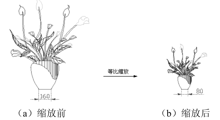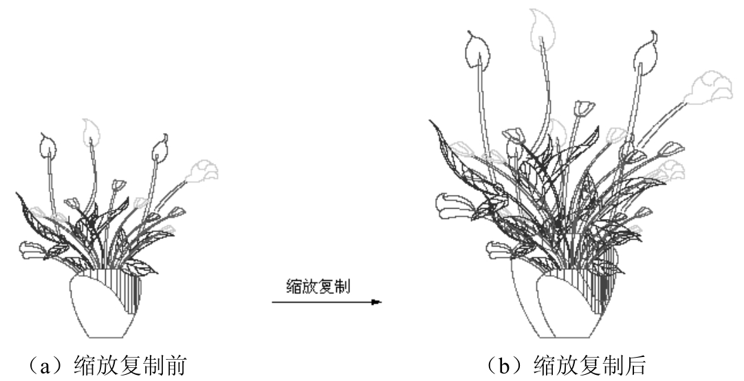 缩放对象指的是将对象进行等比例放大或缩小。执行“缩放”命令可以创建形状相同、大小不同的图形结构。