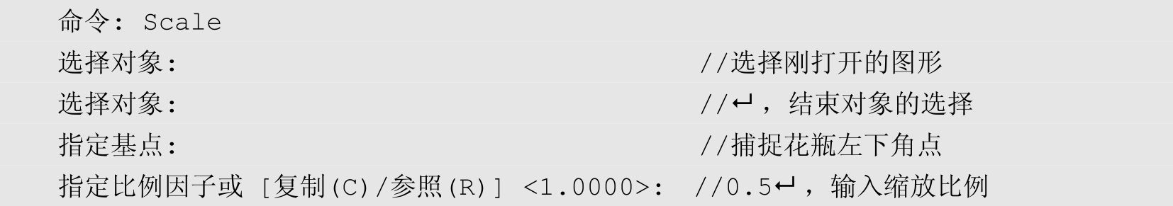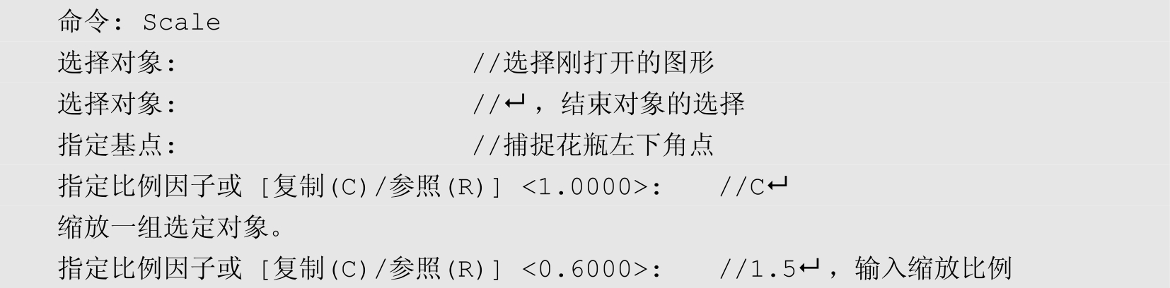 在功能区单击“默认”→“修改”→“缩放”按钮,将图形缩放复制。