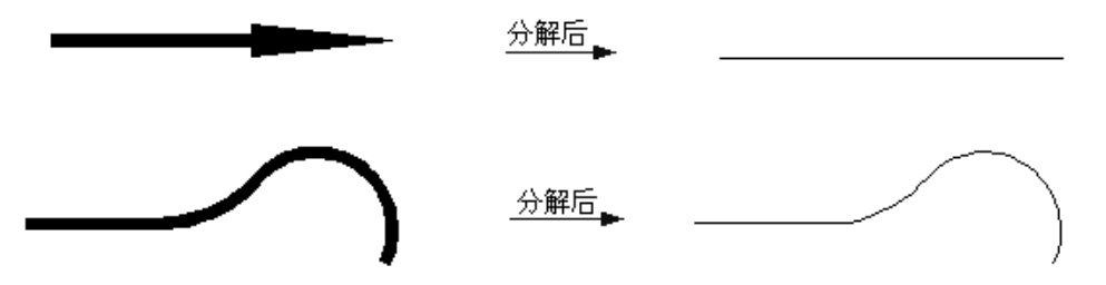 在执行“分解”命令后,只需选择需要分解的对象再按↵键即可将对象分解。如果是对具有一定宽度的多段线进行分解,AutoCAD将忽略其宽度并沿多段线的中心放置分解的多段线,如图4-78所示。