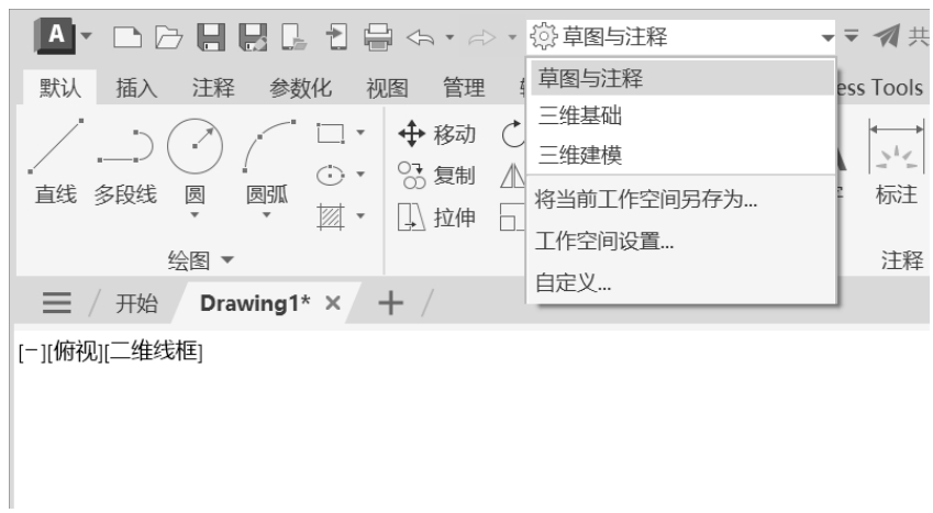无论选择何种工作空间,在启动 AutoCAD 之后,系统都会自动打开一个名为“Drawing1.dwg”的默认绘图文件窗口。无论选择何种工作空间,用户都可以在日后对其进行更改,也可以自定义工作空间并保存。