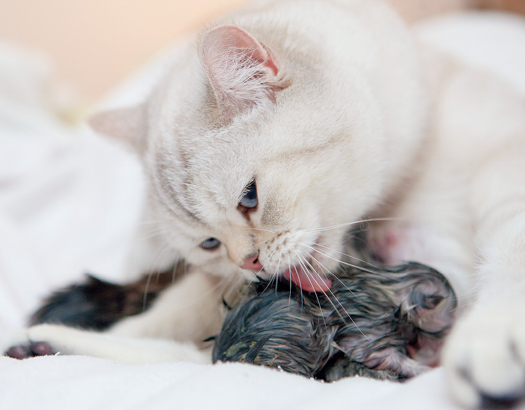 母猫在生下小猫之后,会马上开始照顾自己的孩子。它们会咬断小猫的脐带,并把小猫的身体舔舐干净