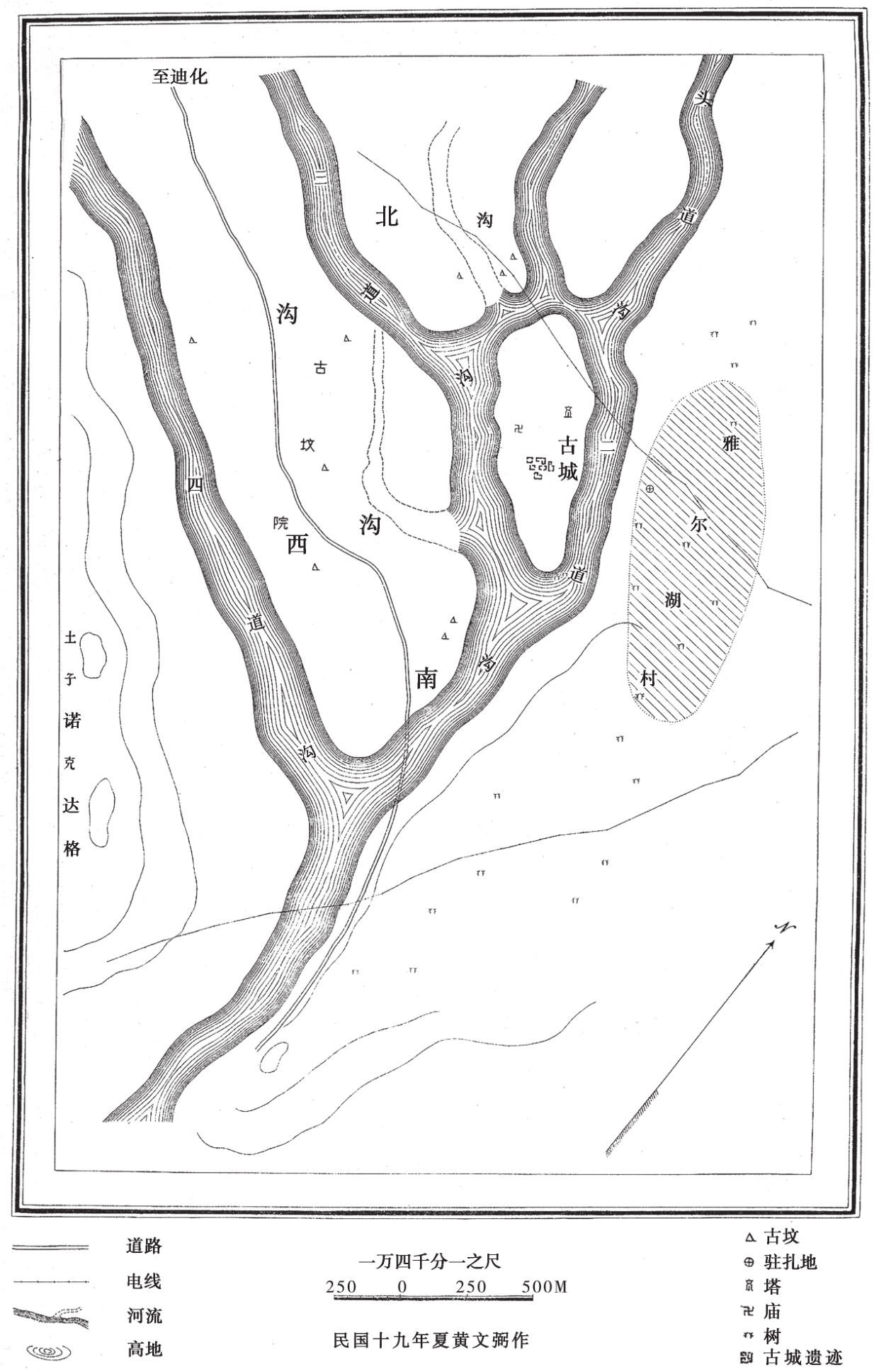 在村庄之西,有古城遗址,颓垣满野,作椭圆形,位于两道甚深之河床中间,隆起平原,遗址即满布于平原上。本地居民称此城为雅尔和图,此二河床在古时本为两河,环流城之两旁,至城之南端而合,故古名此河为交河,此城为交河城。现分四沟,头、二道沟,发源于约干特勒克达克,西南流四十里,经行戈壁,分为二道:一南流为头道沟,一西南流为二道沟,约三十里,至古城之东北隅而合,流于城东。三道沟起自戈壁,南流十余里,绕于城西,至城之南端而与二道沟合。四道沟亦出自戈壁,绕古坟群西,沿土子诺克达格东麓南流至雅尔沟口,而与三道沟合流出口。现均为泉水。出古城北五六里地,而天山之雪水久已不至也。然据《刘土恭墓志铭》云:“东则洋洋之水,南及香香遐岸。”是古时河水甚大,后渐干渴,空存河床,近因泉水涌出,遂恢复古之河流。然当古时水流于甚深之河床围绕故城时,而城上居民吸引之方法如何?当为吾人有趣之研究也。吐鲁番有二大故城:一在吐鲁番之东南五十里阿斯塔拉,为高昌国都城故址。汉时名高昌壁,为戊己校尉所治。一在吐鲁番城西二十里雅尔湖,为汉车师前王庭所治。晋成帝时前凉张骏置交河郡,高昌国因之,唐灭高昌,置西州,始改为交河县。《旧唐书》云:“王都高昌,其交河城汉前王庭也。”《元和郡县志》亦云:“交河东南至州八十里,汉车师前王庭,河出县北天山,分流城下。”所云州,即西州,为高昌国故都。现据余所发现墓砖,在雅尔湖坟群所发现者书交河,在阿斯塔拉所发现者则书高昌,可证此二城,自古为高昌及交河二城,至唐犹相沿未改。至唐之末业,回鹘占领西州,其名称稍异,然畏兀儿仍受辽封,治交河。余尝于高昌、交河故城中掘拾有旧畏兀儿文残纸,皆足为交河古城至元时尚有居民之证也。至元末分设柳城、火州、吐鲁番三部万户府达鲁花赤,而交河、高昌二城遂废。今已禾麦离离,颓垣满野,非复当日人文之盛矣。