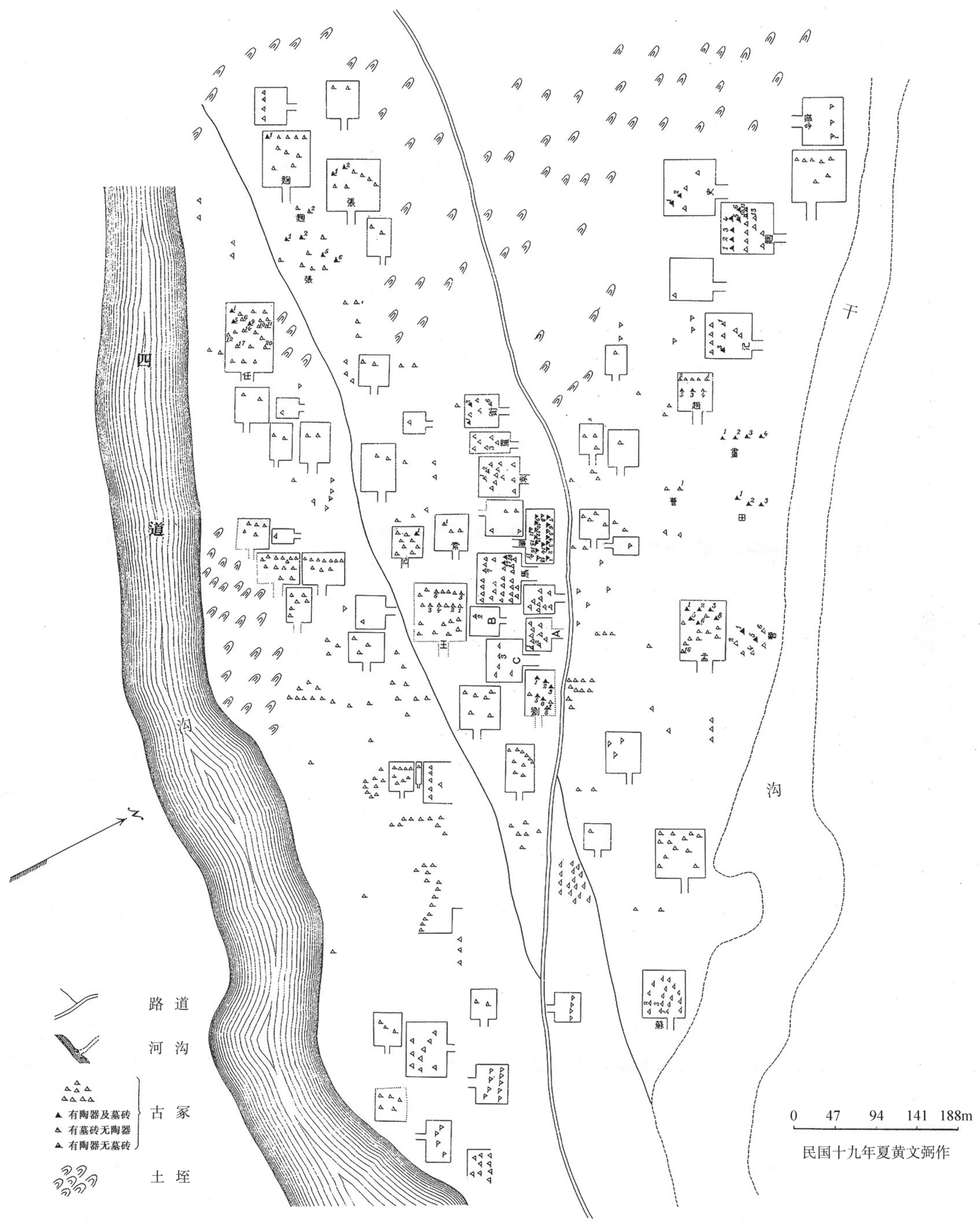 余在此略掘十余冢后,又发掘沟西之大坟区,我称为沟西区。地在四道沟与三道沟之中间,显露一大平原,宽二里许,长六七里。弥望平野,古冢垒垒,隆起高阜,或方或圆,表面满布石块,宽广约十三尺,高亦三尺六七,冢前有石块排立成一线为墓道之表示,而其石线之方向,亦即墓门之方向也。尤其使余感兴趣者,即每聚若干冢为一族,外以石线栏之,前开一门,门线长十余尺,表示其为一族一姓之冥居,非他人所能掺入者。而余在此石线栏中,由其界划之清楚,使余工作亦得按其族姓施行发掘之程序,登录亦极加以慎重与严密,深恐有违死者之意而使其疆界稍有紊乱也。当余发掘之初,初用二十人,分为四组,每组五人,工作一冢,以一人为组长,作监察工作,又以二人为掘手,轮流下坑,探取古物,每组每日可得两冢,后加至三十人分五组,故日可得十冢。自三月一日起工,至十七日止工,中间休息两日,整半月,而余之三十五箱古物,即墓砖一百二十余方,陶器八百余件,皆此十余日中之收获也。至墓室内容,更有趣味,每墓室之前,有一长廊墓道,宽约三尺,长约十八尺,由浅及深,至距地平面约十二尺时,即现墓门,门高约三尺,宽约二尺许,自墓门入,即现宽敞之墓室,宽者约九尺建方,小者亦七尺许,高亦三尺又半。砌土为塌,高尺余,铺以芦席,死者横卧席上,外有木板栏之,无棺椁。陶器即陈于死者头旁,重叠堆聚,大小至数十件。盖余所掘古冢中,均有陶器,置头部或足部旁,或骈陈身之右侧,形成一线,为两死者之间隔,多少大小不一,要皆当时死者日用器物,死后即以此为殉。墓砖则砌入墓道墙壁中,字面向里,砖皆作方形,泥质,经火烧炼而成者。宽约一尺一寸至三寸建方。表面光平。每砖上或用朱写,或用墨写,或刻字填朱,书写死者埋葬年月日及生时官职,其字迹至现在颜色尚如新书也。又在墓内之墓砖多少,恒视墓中死者之数为差,然至多不过三方,盖一夫一妻或一夫一妻一妾也。犹其使吾人于研究方面发生良好之兴趣者,即每冢中之陶器,皆与墓砖同穴并出。由于墓砖上之年代及死者姓名,而陶器之时代与主人,亦可得互相证明也。