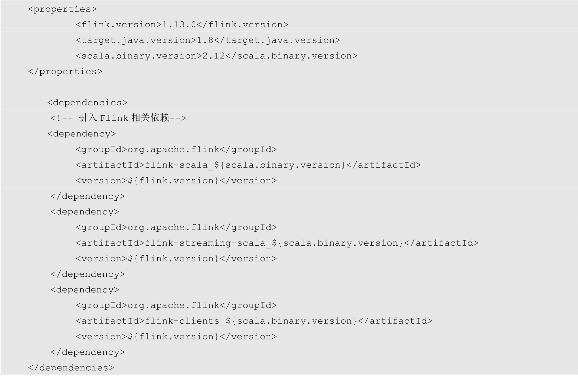 在项目的pom文件中,增加<properties>标签设置属性,然后增加<denpendencies>标签引入需要的依赖。我们需要添加的依赖最重要的就是Flink的相关组件,包括flink-scala、flink-streaming-scala,以及flink-clients(客户端,也可以省略)。