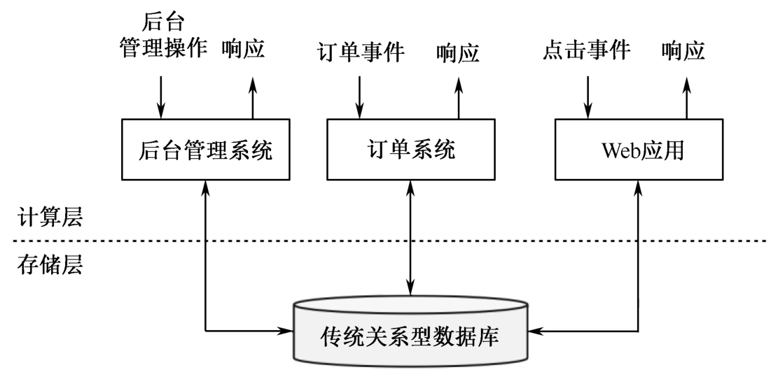 IT互联网企业往往会用不同的应用程序处理各种业务,如内部使用的企业资源规划(ERP)系统、客户关系管理(CRM)系统、面向客户的Web应用程序。这些系统一般都会分层设计:计算层就是应用程序本身,用于数据计算和处理;存储层往往是传统关系型数据库,用于数据存储,如图1-5所示。