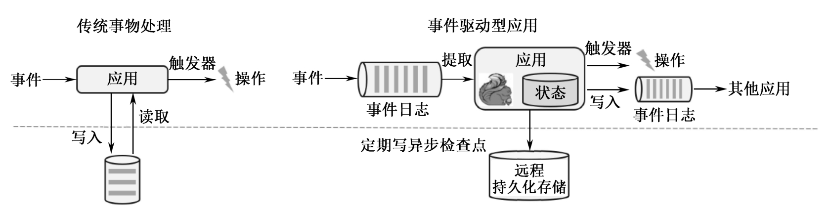 图1-7 传统事务处理与事件驱动型应用对比