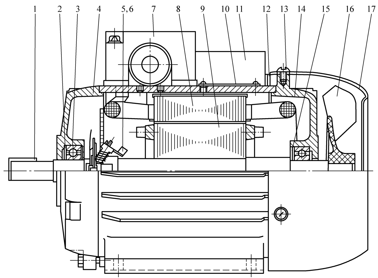 1—键 2—波形弹簧圈 3—轴承 4—前端盖 5,6—离心开关的离心器及开关底板 7—出线盒 8—定子 9—转子 10—铭牌 11—电容器 12—电容器卡子 13—螺钉及垫圈 14—后端盖 15—护油垫 16—风扇 17—风罩