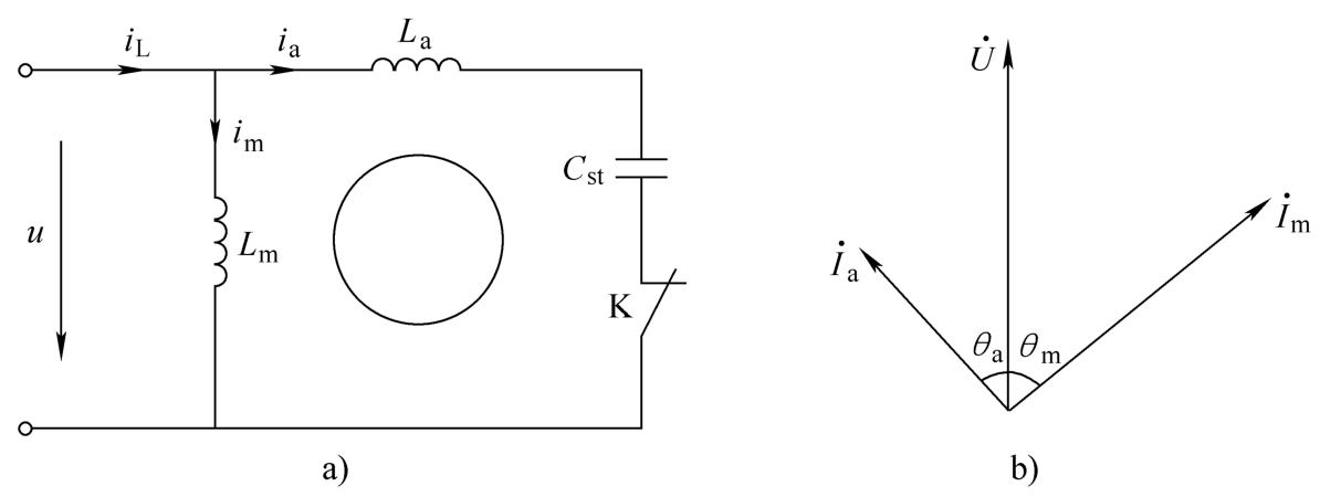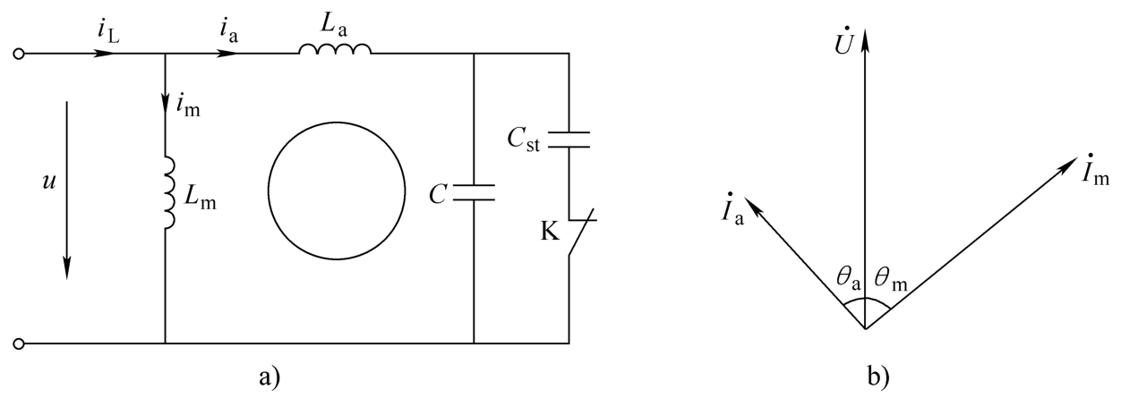 图3-2 单相电容起动异步电动机的原理图和相量图