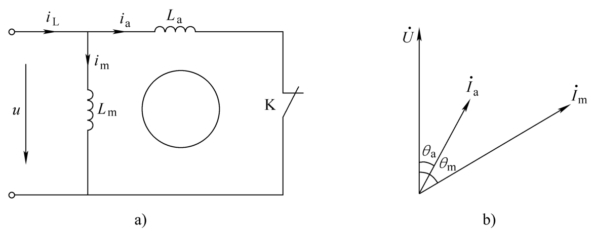 图3-1 单相电阻起动异步电动机的原理图和相量图