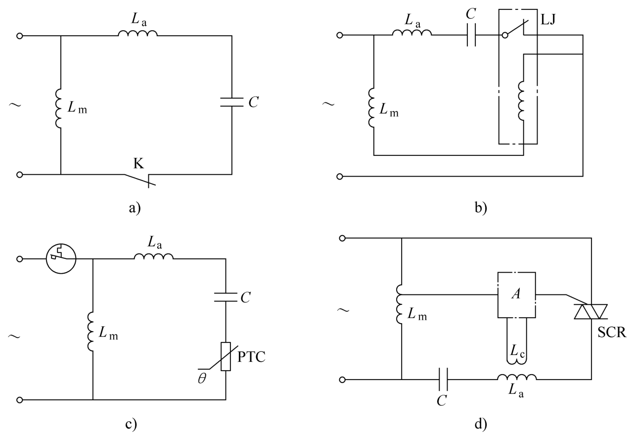 此外,除电容运转单相异步电动机外,单相电动机在起动过程中,都需要借助起动开关。当转子转速达到75%~85%的同步转速时,才切除起动绕组(副绕组)或起动电容器,常用的起动开关是离心开关。除了普通常用的离心开关之外,还有电流、电压起动继电器,正温度系数热敏电阻起动元件(PTC元件)和电子起动装置等。有些专用电动机,如单相潜水电泵、电冰箱压缩机电动机等,由于位置有限、环境限制,或由于双电压、双转速等原因,不便安装离心起动开关,因此采用电流起动继电器、PTC元件和电子起动装置等。带有离心开关、电流起动继电器、PTC元件和电子起动开关的单相电容起动异步电动机线路原理图分别如图3-7a、b、c、d所示。