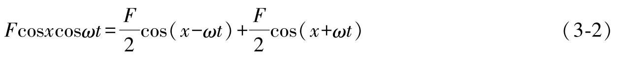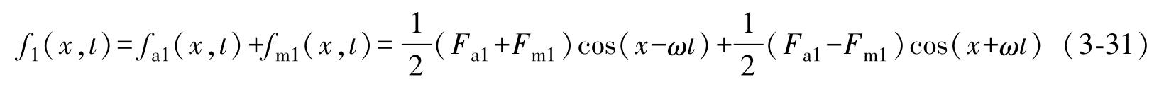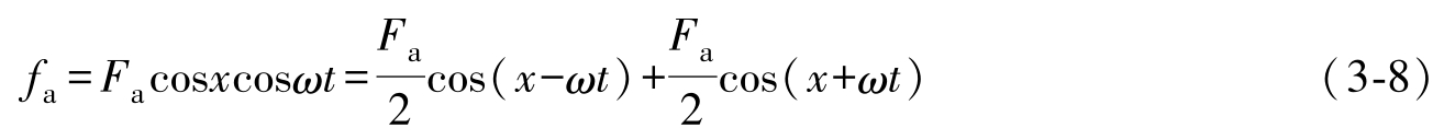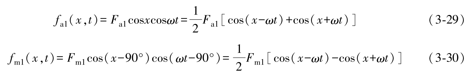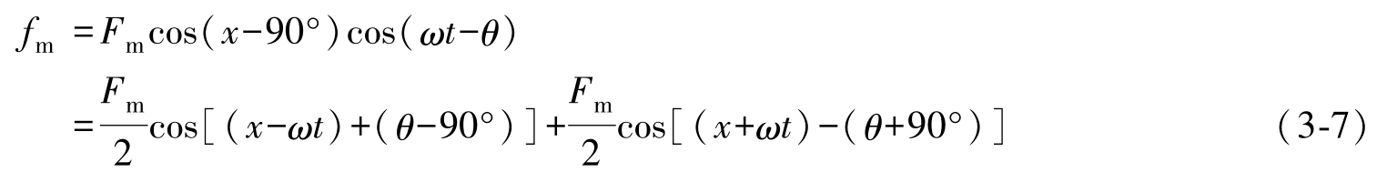 在式(3-2)中,等式的左边和右边在数量上完全相等,但代表的物理意义却不相同。等式左边代表着脉振磁动势,其特征是磁动势的轴线在空间固定不动,但各点磁动势的大小随时间而变化;而等式的右边则分别代表两个旋转磁动势,其中第一项为正向旋转磁动势第二项为反向旋转磁动势