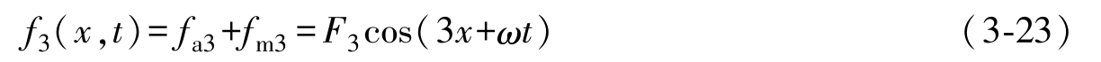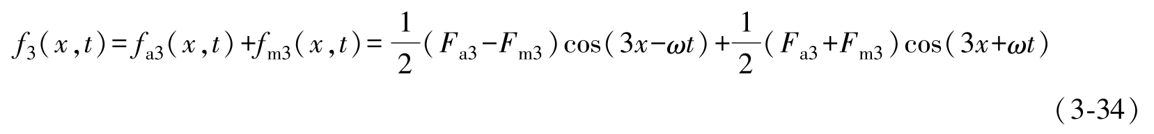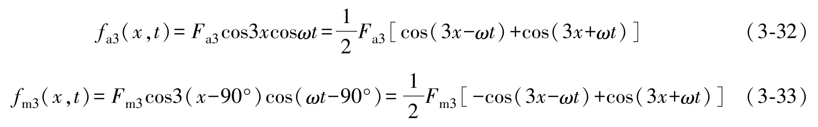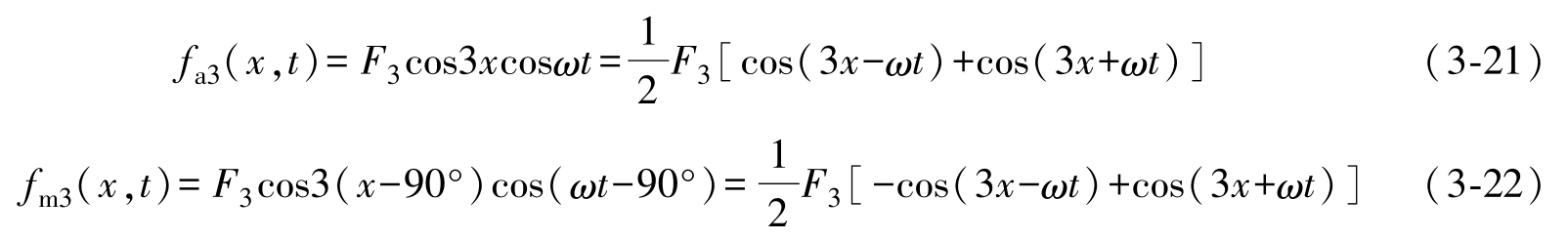 式(3-23)说明3次谐波合成磁动势 f 3 ( x , t )是一个反向旋转的圆形旋转磁动势。用同样的方法可以求得3次谐波磁动势的转速为