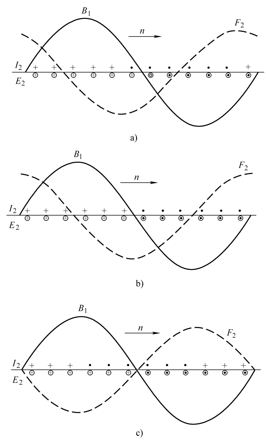 假定一个旋转磁场从左向右旋转,磁场切割转子导体并在其中感应电动势,如图3-12所示。根据右手定则可知,在正半波下转子电动势是流入纸面⊕,在负半波下转子电动势是流出纸面⊙。由于转子绕组是感性的,电流滞后于电动势。因此将转子电动势分布逆着磁场旋转方向移动一个角度,就得到转子电流分布。根据转子电流分布可以得到转子磁动势 F 2 。从图3-12a可以看出,转子磁动势起去磁作用,去磁作用的大小完全由电流滞后的程度来决定。在图3-12b中,当转子电流与转子电动势同相位时,转子磁动势 F 2 与气隙磁通密度 B 1 相比位移90°,两者正交, F 2 不起去磁作用。在图3-12c中,当转子电流滞后转子电动势90°时,转子磁动势 F 2 与气隙磁通密度 B 1 位移180°, F 2 便有强烈的去磁作用。因此转子电流的去磁作用由电流滞后的程度来决定,电流越滞后去磁作用越强烈。