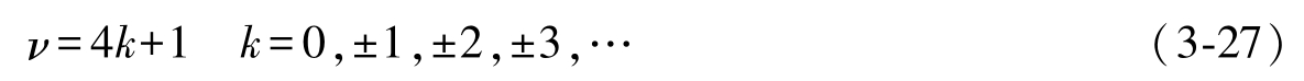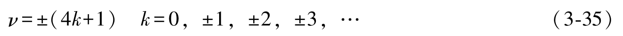 用同样的方法,可以对任意 ν 次谐波进行分析,得到结论是:在不对称运行时,两相绕组所产生的每一次谐波磁动势都包含两个分量,即正向旋转的圆形旋转磁动势和反向旋转的圆形旋转磁动势。因此不对称运行时的谐波磁动势分量要比对称运行时多一倍。其谐波次数可用式(3-35)表示: