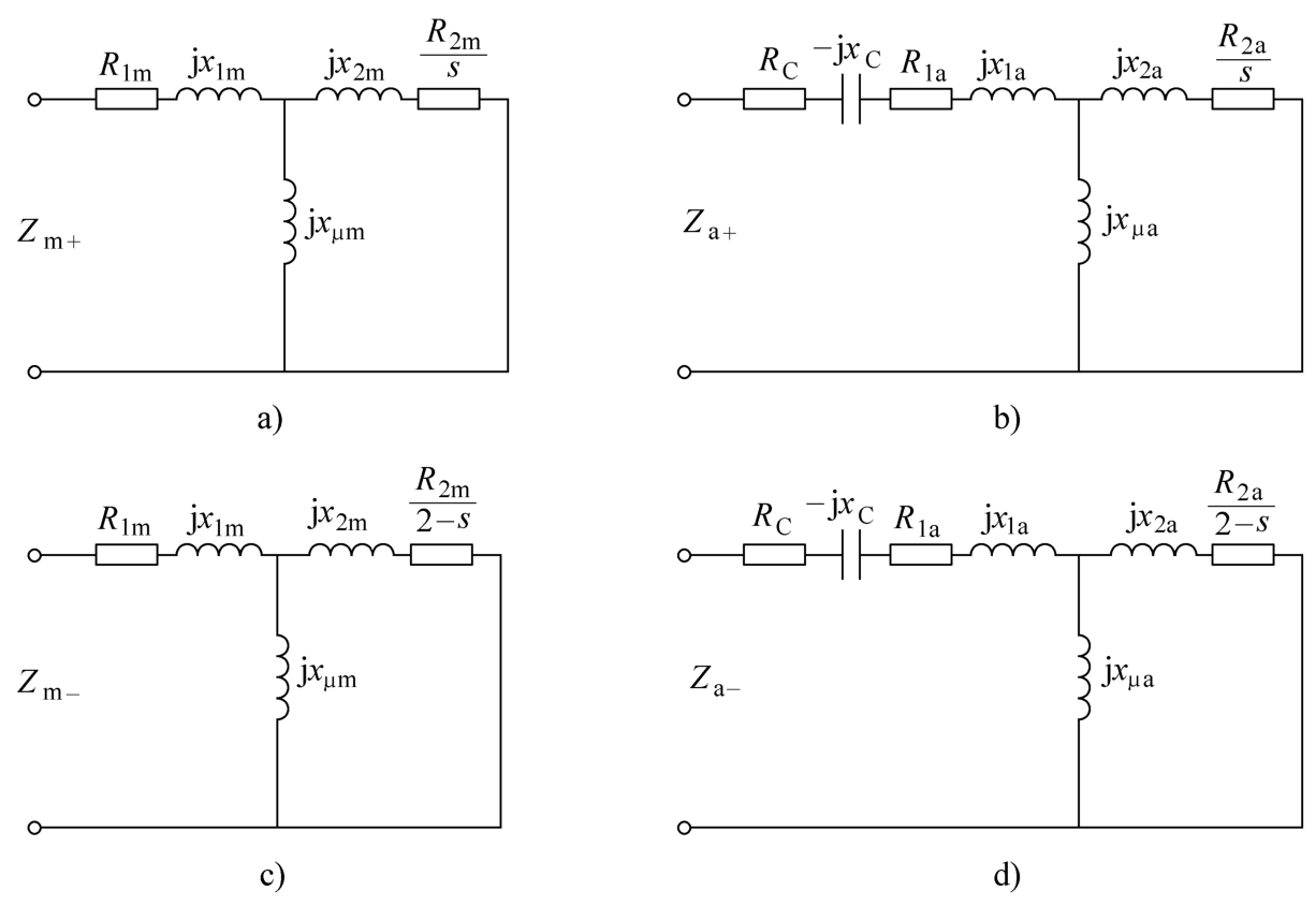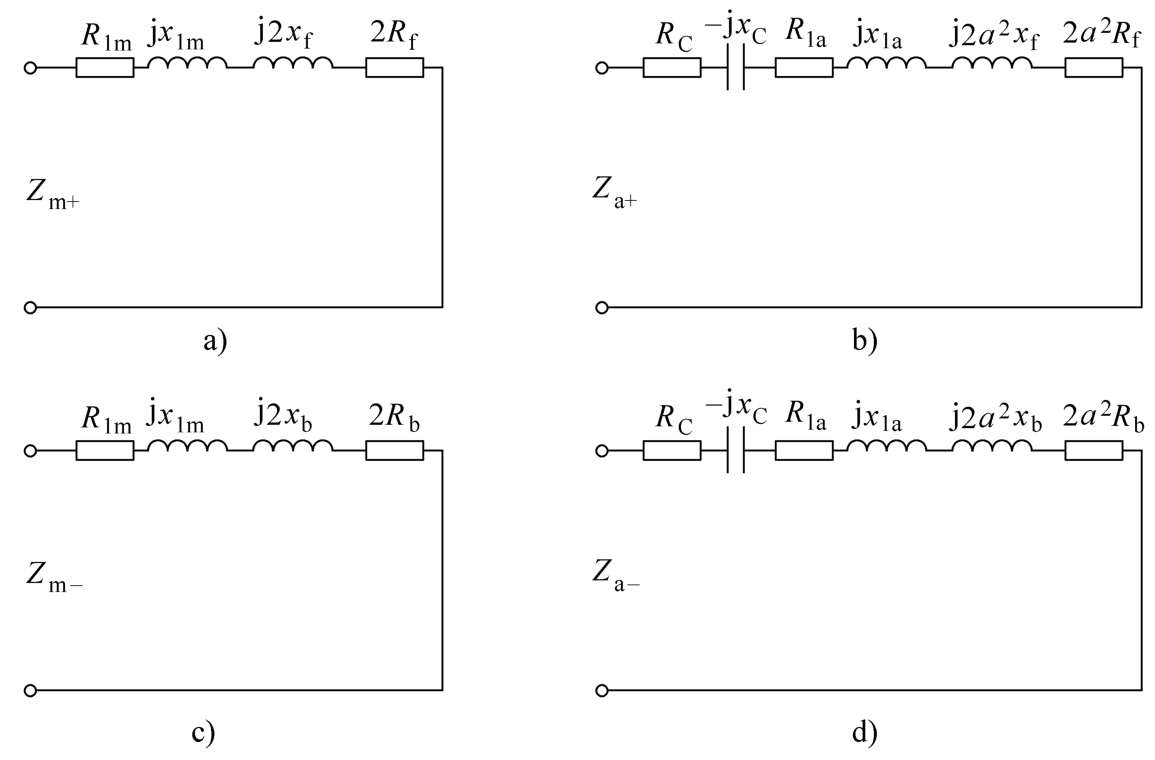a)主相m的正序等效电路 b)副相a的正序等效电路 c)主相m的负序等效电路d)副相a的负序等效电路