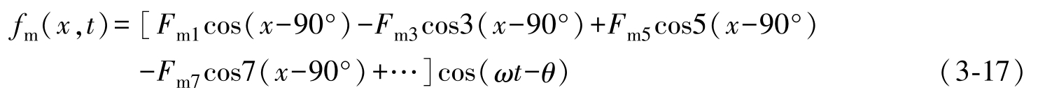 2.两相绕组的谐波磁动势 当单相电阻起动和电容起动异步电动机起动时或电容运转单相异步电动机运行时,总是由两相绕组共同作用而产生磁动势,即将式(3-16)和式(3-17)叠加。下面分两相绕组对称运行和不对称运行进行研究。