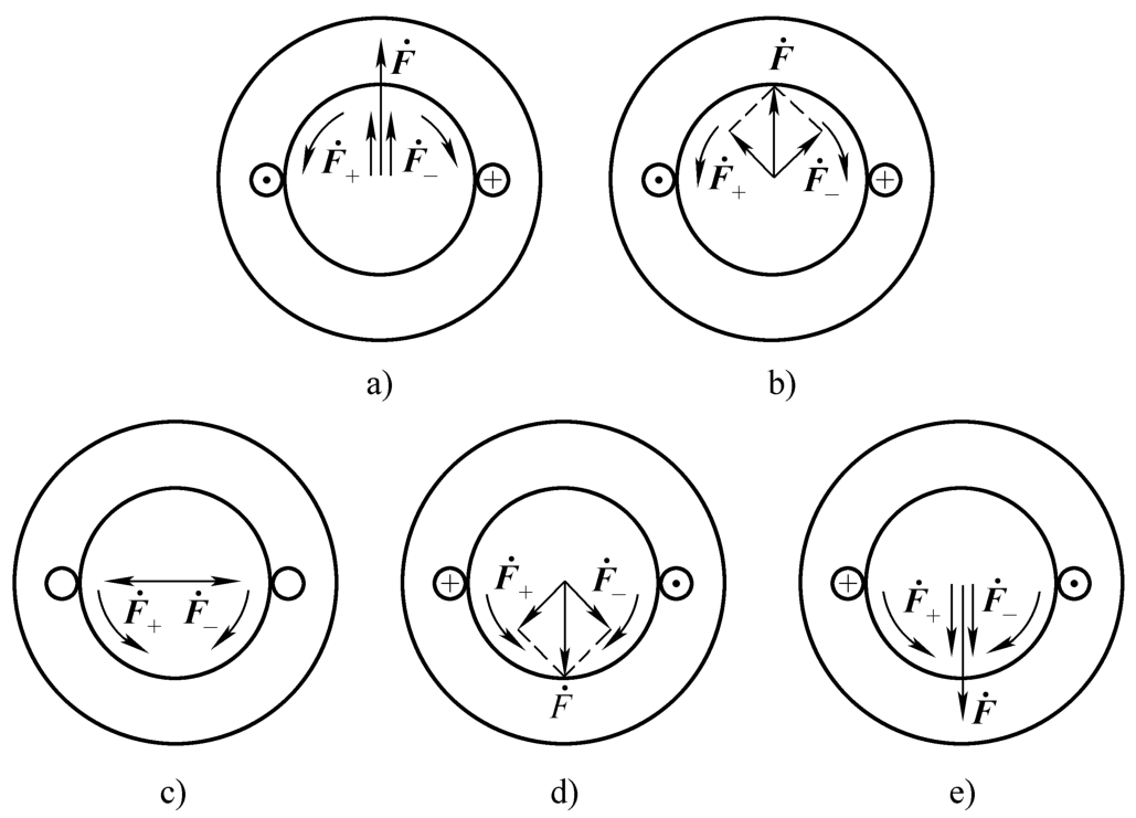 来代替。从图3-8中五个不同的瞬时可以清楚地看到,当脉振磁动势的幅值为最大时,两个旋转磁动势正好转到互相重合的位置,脉振磁动势的幅值为两个旋转磁动势相量的代数和(见图3-8a、e)。当脉振磁动势幅值减小时,两个旋转磁动势互相离开,此时脉振磁动势的幅值为两个旋转磁动势相量的相量和(见图3-8b)。当脉振磁动势幅值为零时,两个旋转磁动势恰好转到相反的位置,旋转磁动势互相抵消(见图3-8c)。当脉振磁动势为负值时,两个旋转磁动势的夹角大于180°电角度(见图3-8d)。上面的分析也说明了一个脉振磁动势可以分解成两个大小相等、转向相反的圆形旋转磁动势。这个重要概念是分析单相电动机工作原理的基础。