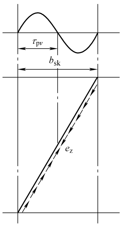 所谓转子斜槽,就是转子上的槽不是与转子轴线平行,而是斜过一个角度。转子槽斜过的距离 b sk 一定要等于能产生附加转矩的那一次谐波极距的2倍,如图3-15所示,即