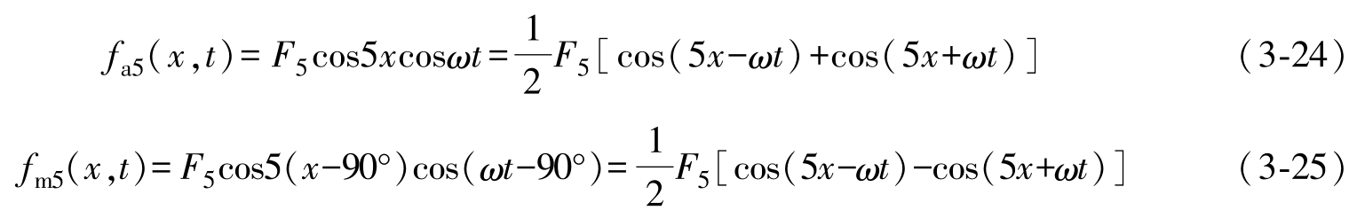 式(3-26)说明5次谐波合成磁动势是一个正向旋转的圆形旋转磁动势。用同样的方法可以求得5次谐波磁动势的转速为