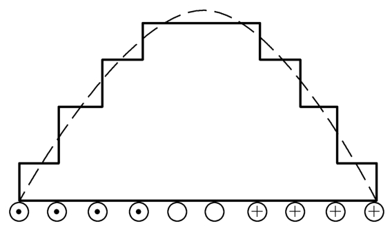 正弦绕组可以明显削弱定子绕组产生的磁动势谐波,但不能消除磁动势谐波。根据式(3-43)可知,要使磁动势曲线为一正弦波,则导体必须按余弦规律连续分布。但实际上导体总是放在槽里,或者为了节省铜线,往往采用一定的空槽,这样导体就不可能按余弦规律连续分布,而是断续分布的。这种绕组所产生的磁动势波形呈现阶梯形,如图3-14所示。阶梯形波与正弦波之差,就使正弦绕组所产生的磁动势中存在高次谐波,这种谐波与定、转子齿槽存在有关,称为齿谐波。所以正弦绕组只能削弱谐波磁动势,并不能完全消除谐波磁动势。生产实践中通常采用转子斜槽来进一步削弱谐波磁动势对电动机起动性能和运行性能产生的不利影响。