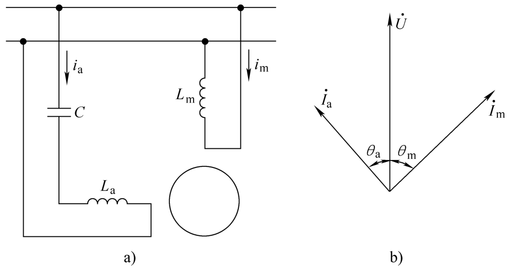 图3-10为起动绕组回路串入电容的单相异步电动机原理图及两相绕组通入电流和外施电压的相量关系,参照式(3-1)可以分别得到: