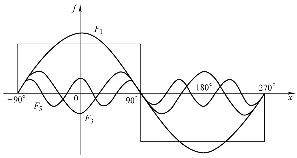 3)在坐标原点 x =0处,如果基波为正值,3次谐波便为负值,5次谐波又为正值,7次谐波又为负值等,如图3-13所示。