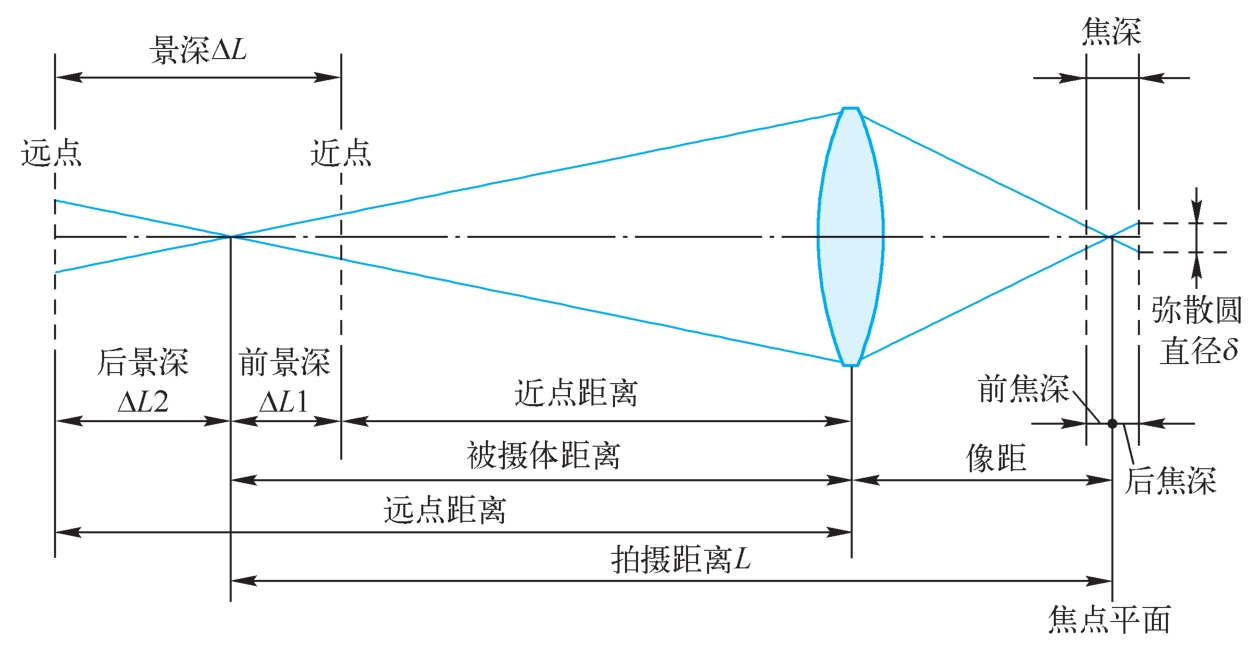 景深(Depth of field, DOF)是指在摄影机镜头前沿能够取得清晰图像的成像所测定的被摄物体前后距离范围如图2-12所示。在聚焦完成后,在焦点前后的范围内都能形成清晰的像,这一前一后的距离范围,称为景深。景深随镜头的光圈值、焦距、拍摄距离而变化。光圈越大,景深越小;光圈越小、景深越大。焦距越长,景深越小;焦距越短,景深越大。距离拍摄体越近时,景深越小;距离拍摄体越远时,景深越大。