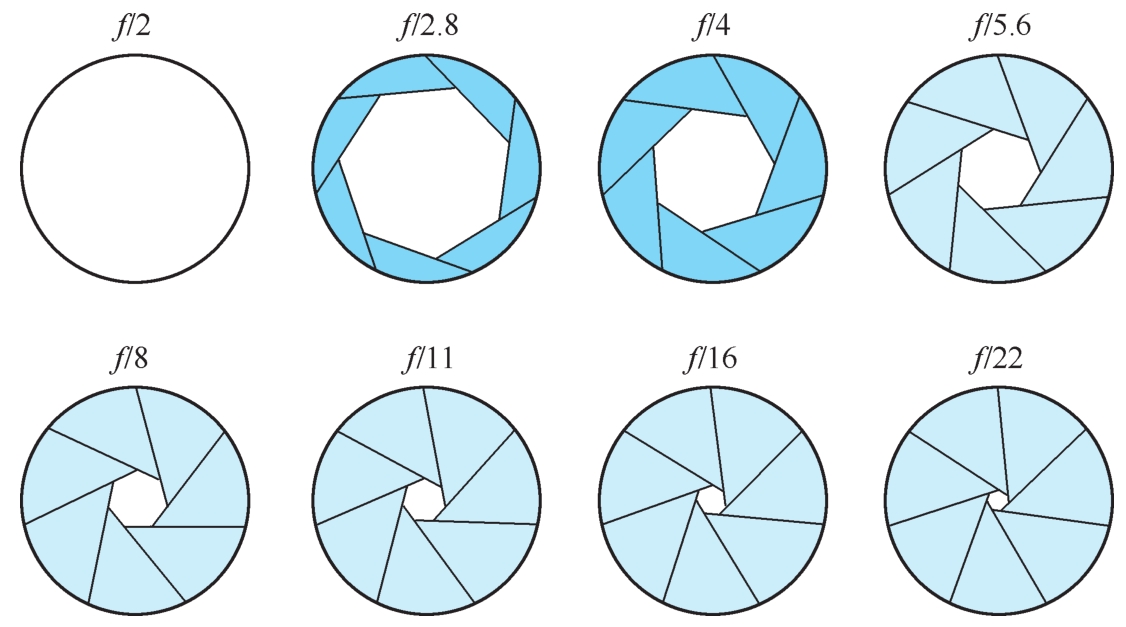 如图2-11所示,光圈(Aperture)是机械装置,是一个用来控制光线透过镜头,进入机身内感光面的光量的装置,它通常在镜头内,通过控制镜头光孔的大小来达到这一作用。当外界光线较弱时,就将光圈调大;反之,就将光圈调小。光圈大小用镜头焦距 f 和通光孔径 D 的比值来衡量,用 f 值表示。完整的光圈值由小到大依次为: f /1、 f /1.4、 f /2、 f /2.8、 f /4、 f /5.6、 f /8、 f /11、 f /16、 f /22、 f /32、 f /44和 f /64。