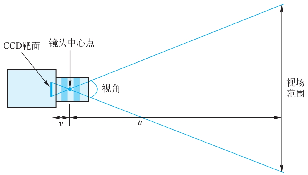 在已知相机CCD尺寸、工作距离和视野的情况下,可以计算出所需镜头的焦距 f 。