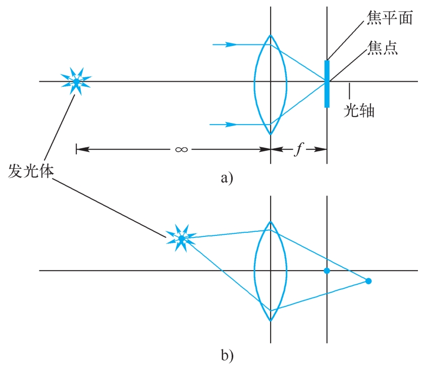 图2-8展示了工业镜头成像的基本性质。如图2-8a所示,假设发光体位于无限远处(无穷远处物体所发光被认为是平行光),将工业镜头(透镜)与这些平行光垂直,则这些光线将聚集在一点,这一点就是焦点。换句话说,焦点是无限远处光源的映射。工业镜头与焦点之间的距离称为焦距 f 。因此,如果想要在图像传感器(焦平面)上获取一个无限的远物体的像,工业镜头与图像传感器的距离就正好是镜头的焦距。如果将发光体移近工业镜头,如图2-8b所示,工业镜头就将光线聚焦在焦点前面,因此如果要获取尖锐的图像,就必须增加镜头与传感器的距离。因此,镜头对焦意味着改变工业镜头本身与图像传感器的距离,距离改变靠机械装置进行约束。这不仅应用于理想的薄透镜,也可以应用于实际由多镜片组成的复合镜头。