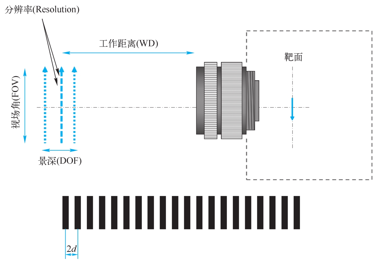 分辨率描述的是图像采集系统能够分辨的最小物体的距离,如图2-13所示。通常用黑白相间的线来标定镜头的分辨率,即像面处镜头在单位毫米内能够分辨的黑白相间的条纹对数,即每毫米多少线对,大小为1/2 d ,单位是“线对/毫米”(lp/mm)。分辨率越高的镜头成像越清晰。镜头的分辨率要与相机的分辨率匹配,大于或等于相机的分辨率。