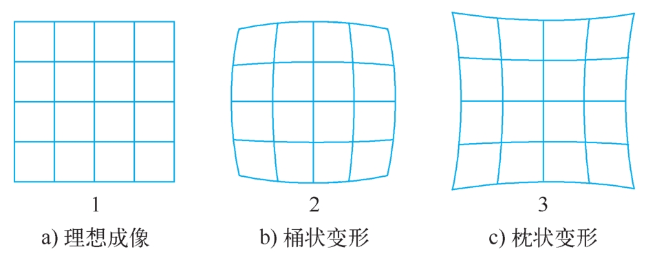一条直线经过镜头拍摄后,变成弯曲的现象,称为畸变像差。理想成像中,物像应该是完全相似的,也就是成像没有带来局部变形,如图2-14a所示。但是实际成像中,往往有所变形,如图2-14b和图2-14c所示,向内弯的是桶状变形(Barrel),向对角线方向往外弯的是枕状变形(Pincushion)。畸变的产生源于镜头的光学结构、成像特性使然。畸变可以看作是像面上不同局部的放大率不一致引起的,是一种放大率像差。