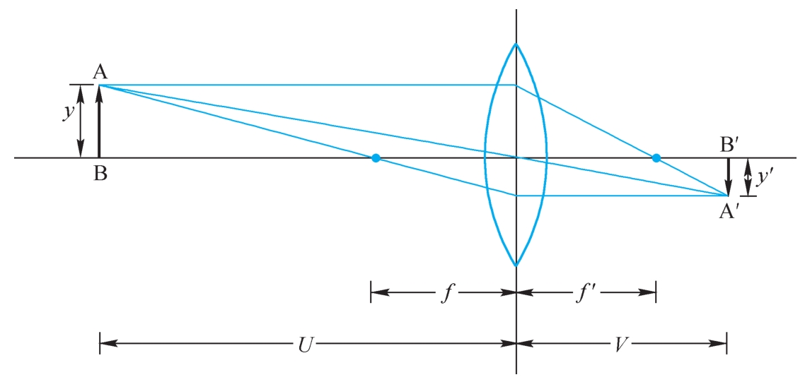 其中, V 和 U 分别是工业镜头光心到图像传感器的距离和工业镜头光心到物体的距离, y′ 和 y 分别是图像的大小和物体的大小。 V 与 U 之比就是放大因子 m (或称放大倍率)。