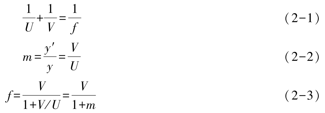 理想薄透镜成像原理如图2-9所示。当镜头应用于不同检测场合时,利用理想薄透镜公式与实际透镜组计算公式,来计算出所需的焦距。公式(2-1)是对于理想薄透镜的基本透镜公式,由图2-9可以得到公式(2-2),进而推导出公式(2-3)。