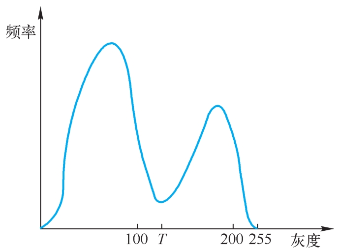 假设一幅图像背景是浅色的,图中有一个深色的物体,图3-9所示为这类图像的双峰直方图。物体中的深色像素产生了直方图上的左峰,而浅色像素的灰度级产生了直方图上的右峰。物体边界处于两个峰值之间,其灰度级的像素数目相对较少,从而产生了两峰之间的谷。选择谷作为灰度阈值将图像二值化,将得到物体的边界。