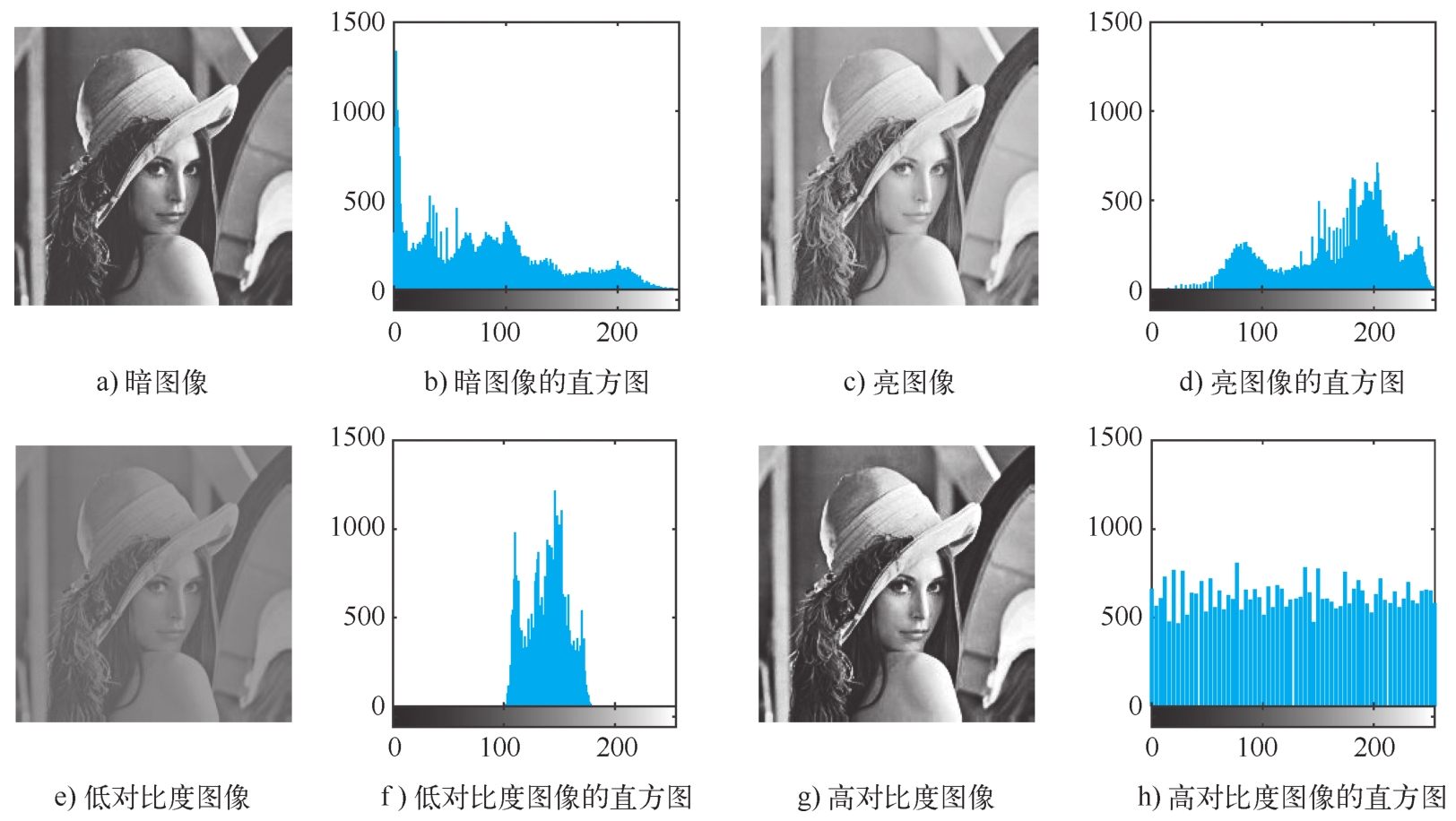 我们注意到,暗图像直方图的分量集中在灰度级低(暗)的一端,亮图像直方图的分量则倾向集中于灰度级高的一端,低对比图像的直方图灰度级范围较窄,高对比图像直方图的分量覆盖了较宽的灰度级范围。直观上,可以得出这样的结论:若一幅图像的像素倾向于占据整个可能的灰度级并且分布均匀,则该图像会有较高的对比度,并展示灰色调的较大变化。