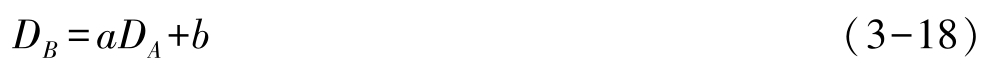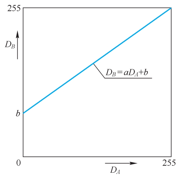 式中, D A 为输入点的灰度值; D B 为响应输出点的灰度值。显然,这种线性点运算关系可用图3-11表示。
