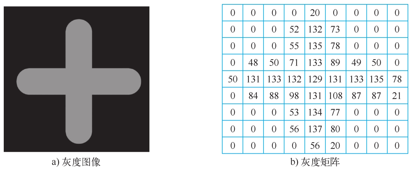 图1-3a为图1-2a的灰度图,该灰度图在计算机中由图1-3b所示的灰度矩阵来表示。图1-3a的图像分辨率为9×9。
