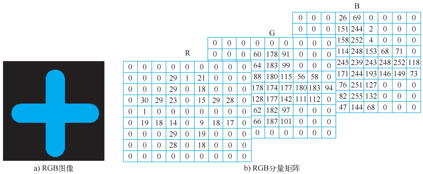 如图1-2a所示的蓝色加号图像,其R、G、B分量在计算机中由图1-2b所示的三个矩阵来表示。根据RGB分量矩阵可知,图1-2a的分辨率为9×9×3。