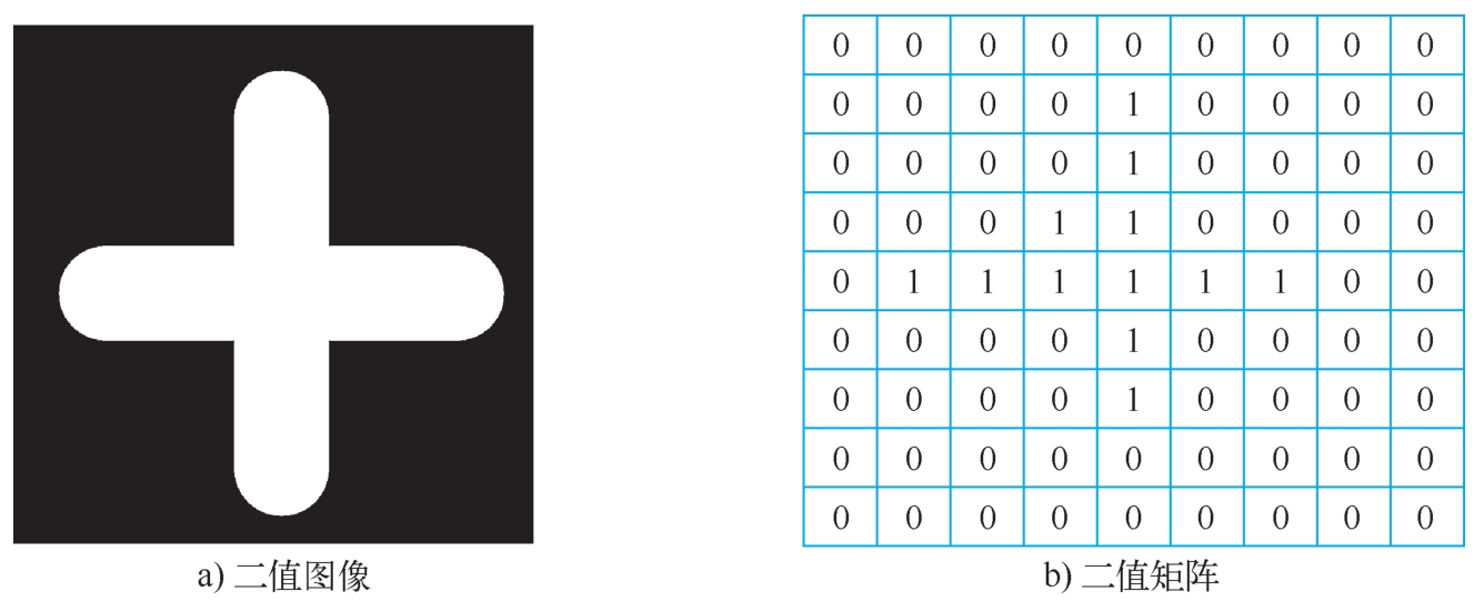 图1-4a是图1-2a和图1-3a的二值图像,可由图1-4b所示的二值矩阵来表示。图1-4a的分辨率为9×9。