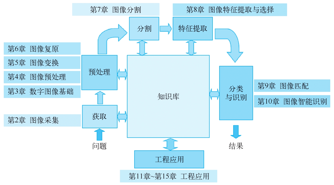 图像分类与识别是利用图像匹配技术、聚类分析、神经网络等模式识别方法对图像目标进行分类和识别,得到最终的检测结果。该部分内容将在第9章和第10章中讲述。