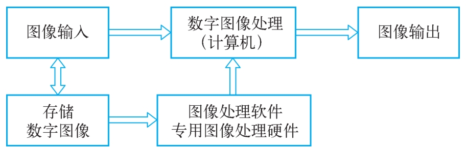 数字图像处理(Digital Image Processing)是指应用计算机来合成、变换已有的数字图像,从而产生一种新的效果,并把加工处理后的图像重新输出,这个过程称为数字图像处理,也称之为计算机图像处理(Computer Image Processing)。数字图像处理系统的组成架构如图1-5所示。数字图像处理模块是该系统的核心模块,它的研究水平直接决定该系统的质量。