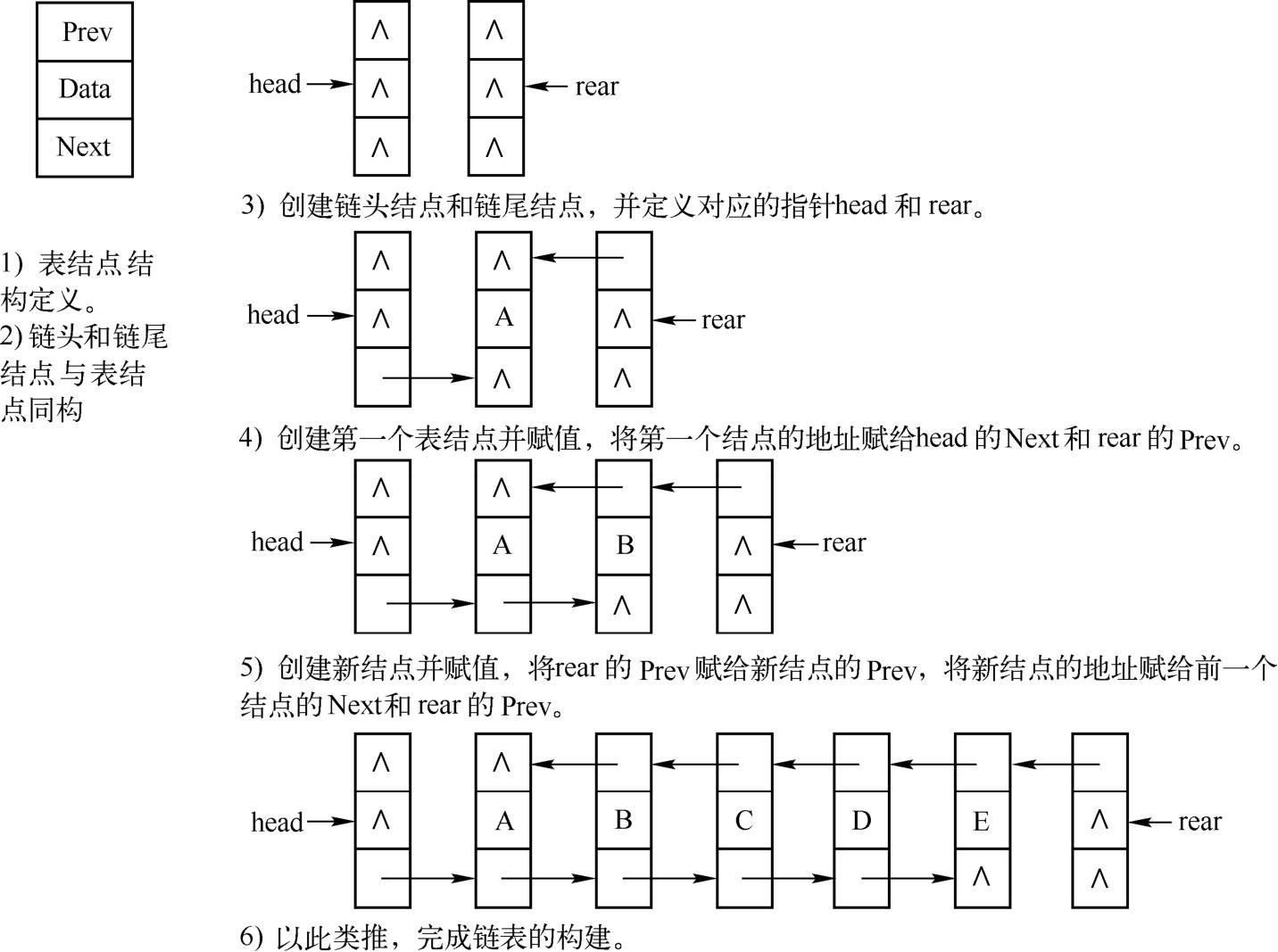 1)定义表结点结构,包含数据域Data,前驱指针域Prve,后继指针域Next。