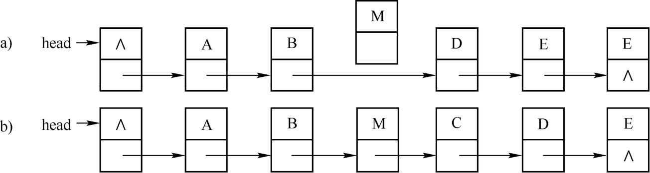 在第i个数据元素之后插入一个值为M的元素,首先,要为该元素申请一个新结点作为存储空间,在新结点的数据域存放值M;其次,找到第i个结点,令新结点指针域的指针等于第i个结点指针域的指针,修改第i个结点的指针,让其存放这个新结点的地址。插入表结点的过程如图3-7所示。