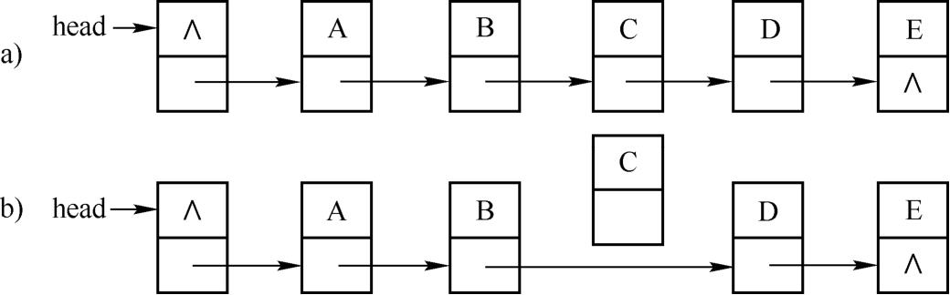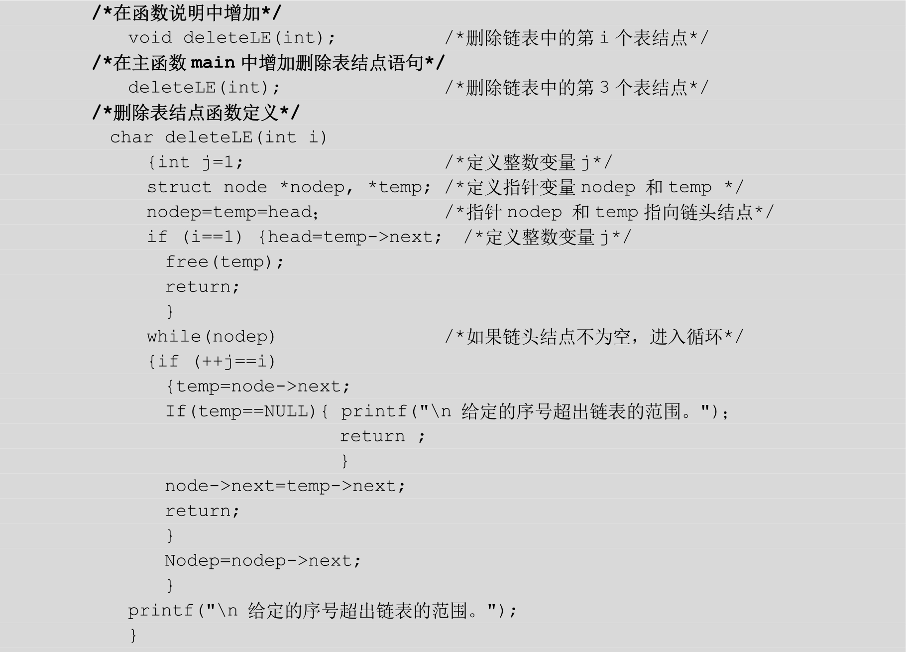 若删除第i个元素,则要找到第i-1和第 i 个结点,并将第i-1个结点指针域中第i个结点的地址改为第i+1个结点的地址,最后释放第i个结点所占的存储空间。删除表结点的过程如图3-6所示。