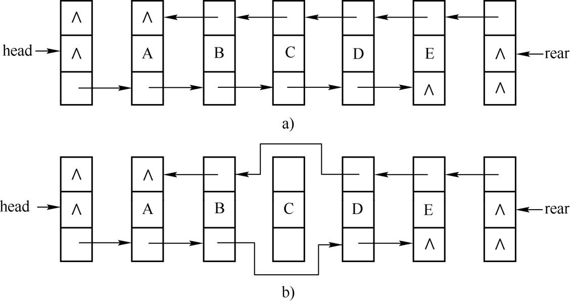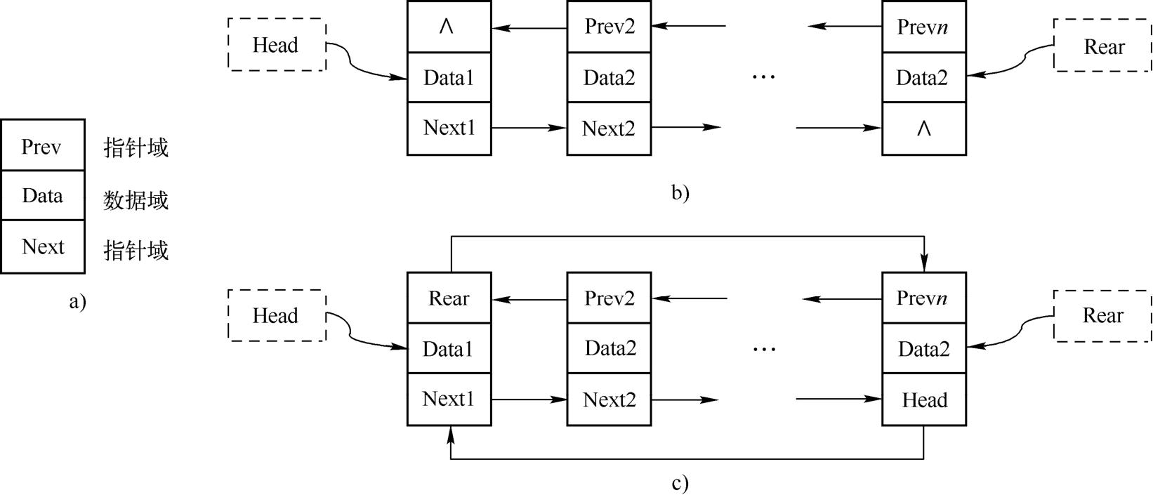 a) 表结点 b) 双向链表 c) 双向循环链表